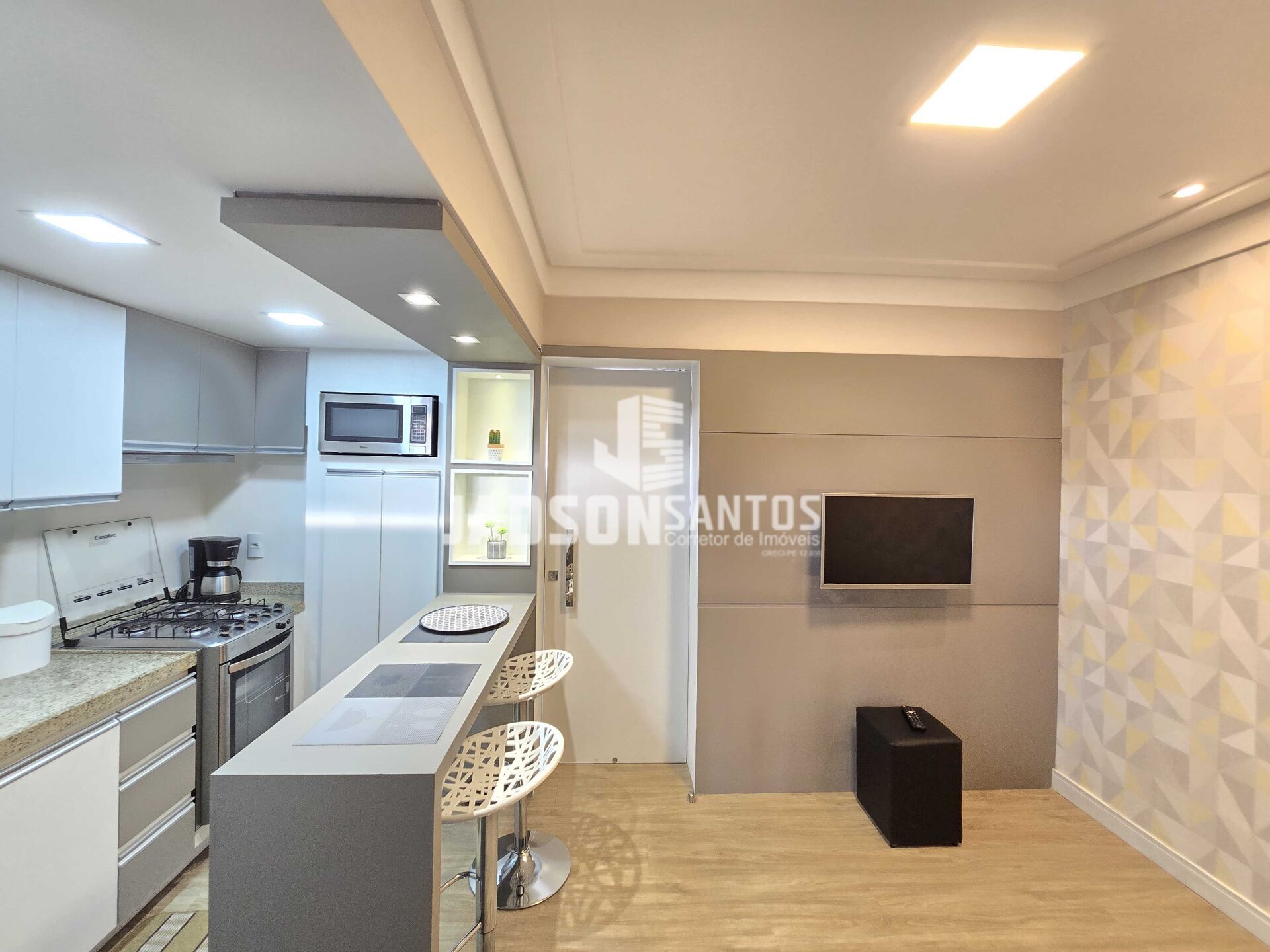 O flat está super bem dividido em sala, cozinha americana, e 1 suíte, todo mobiliado, flat muito confortável.